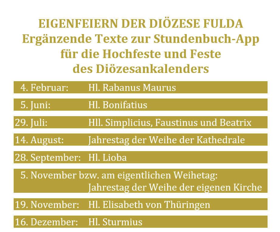 Texte zum Stundengebet für die Hochfeste und Feste des Diözesankalenders als PDF. Da diese in der Stundenbuch-App des DLI nicht enthalten sind, wird das vollständige Stundengebet für diese Feiern hier in digitaler Form zur Verfügung gestellt.