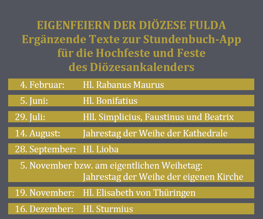Texte zum Stundengebet für die Hochfeste und Feste des Diözesankalenders als PDF. Da diese in der Stundenbuch-App des DLI nicht enthalten sind, wird das vollständige Stundengebet für diese Feiern hier in digitaler Form zur Verfügung gestellt.